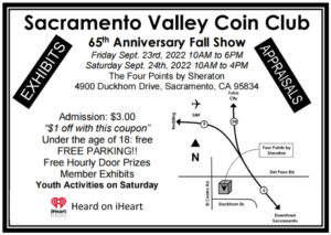 The Sacramento Valley Coin Club has been hosting some of the best coin shows in Sacramento for over 50 years and their fall coin show is coming up this fall on Friday & Saturday September 23rd & 24th at the Four Points by Sharaton right inside their ballroom!